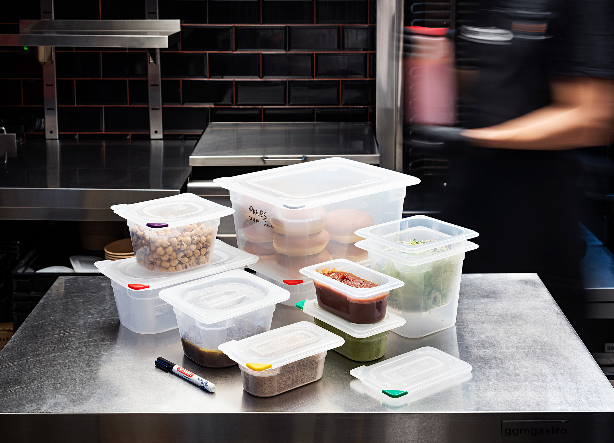 The COMIDA series from Araven offers stackable GN containers made of polypropylene for professional use in kitchens and catering. Temperature-resistant up to +95°C, food-safe, dishwasher-safe, and equipped with a textured labeling area and practical measuring scale—ideal for the safe storage, labeling, and serving of food. Integrated weekday and time markings facilitate process control.