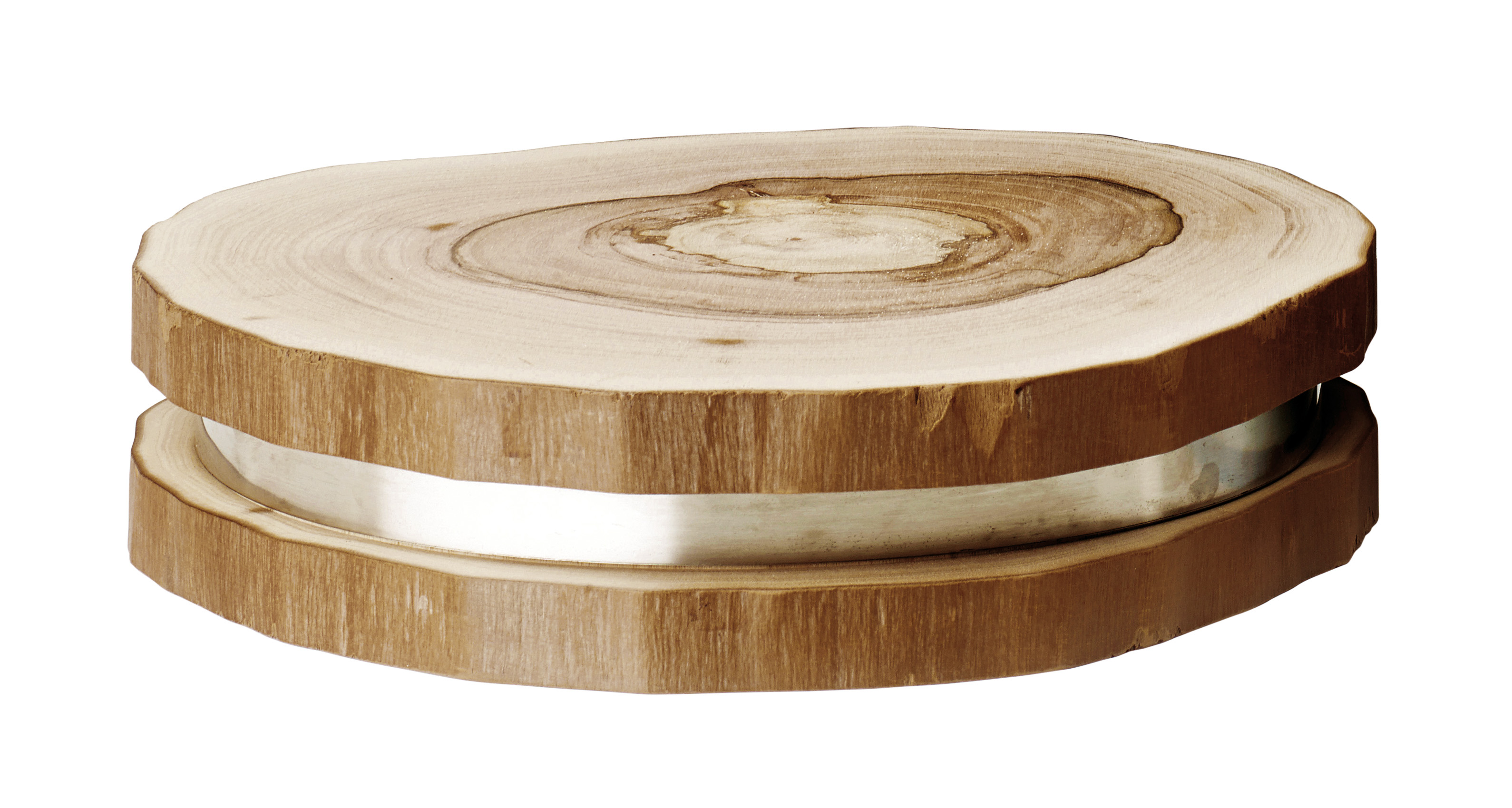 | 9608600 | Ausstell- u. Servierbrett "La Noce" Baumscheibe Walnuss, rund, 40/10cm, mit Edelstahlband | 40/10 cm |